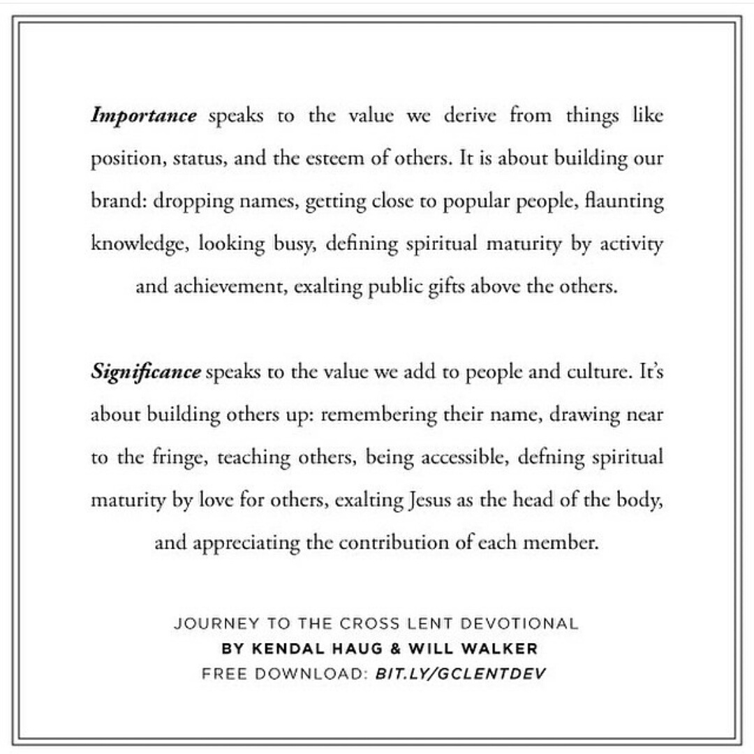 I want to leave a legacy of a life based on the characteristics of someone having significance.  God calls us to live in community.  With him and each other.  Real community can only be built when people care more about significance than importance.  But community building is hard.  It requires humility, vulnerability, and honesty.
